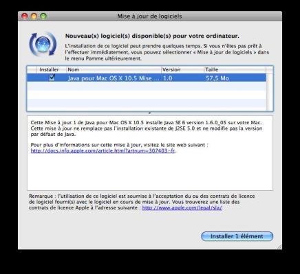Apple a publié une mise à jour très attendue pour les possesseurs de Leopard : l’environnement Java 6, disponible sous la forme d’un téléchargement dans la rubrique «Mise à jour de logiciels», dans le menu Pomme.